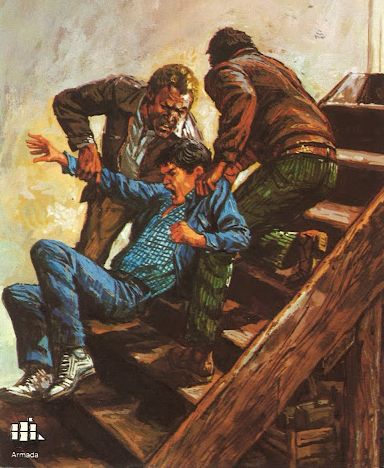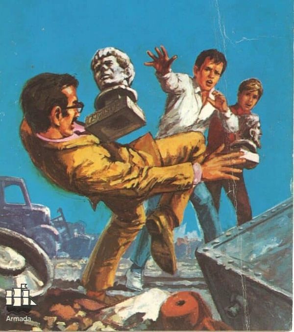 Und auch hier gibt es ein paar verdammt gute Szenen – nicht zu viele, es wird nicht plötzlich von der klassischen Ermittlungsarbeit in Richtung actiongeladenes Abenteuer driften -, aber das, was hier zu finden ist, ist auf eine Art und Weise intelligent genutzt, so dass man das Gefühl hat, es schon einmal erzählt, es aber noch nicht gezeigt bekommen hat. Die Tatsache, dass ein Kapitel mit dem Titel ‚Des Rätsels Lösung‘ tatsächlich einige handfeste Schlussfolgerungen liefert, und zwar auf der Grundlage von Informationen, die man selbst hat (obwohl – einige davon hat man eben nicht – aber man braucht sie auch nicht wirklich…), ist ein Vergnügen, und Arthur legt eine mehr als passable falsche Fährte und schafft es, in einer Schlüsselphase eine überraschende Wendung einzubauen… Meine Güte, das ist ja fast ein wirklicher klassischer Kriminalfall! Es gibt Wortspiele, es gibt ein mäßig komplexes Hin und Her von wechselnden Machtverhältnissen zwischen nicht nur einer, sondern zwei Gruppen von Bösewichten, und zum ersten Mal werden die scheinbar unbedeutenden Aktivitäten der Jungs, die eher immer in ihre Fälle stolpern und dann darauf reagieren, tatsächlich mit Bedeutung gefüllt. Man stelle sich Arthur vor, wie er mit einer Zigarette zwischen den Zähnen auf einer alten Schreibmaschine herumhämmert: „Ihr wollt Zusammenhänge? Ich gebe euch Zusammenhänge…!“